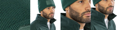 Double knit beanie made from 50% recycled materials. Cotton twill patch for printers. Double thickness. Full size style. Soft-feel knit. Deep cuff. .