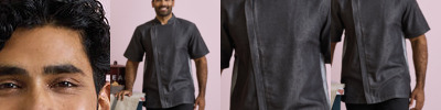 65% polyester/35% cotton. In transition to using recycled polyester.Mandarin collar stand.Stainless steel stud closure.Unisex closure to left or right.Left sleeve pen pocket.Industrial or domestic wash 65°C.Branded tab on left sleeve.
