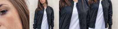 Neutral size label without branding, neck print possible. Rip cuff at the hem. Side pockets above hem. Bomber jacket style.