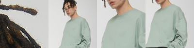 Unisex boxy dry hand-feel crew neck sweatshirt. Set-in sleeve. 2x1 rib at neck collar, sleeve hem and bottom hem. Herringbone back neck tape. Self-fabric half-moon at back neck. Armhole, sleeve hem and bottom hem with twin-needle topstitch.
