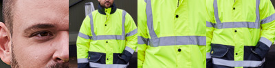 300D polyester. Quilted lining.Conforms to EN ISO 20471: 2013 + A1: 2016 class 3, EN343: class 3:1.Waterproof with taped seams.Fleece lined inner collar.Concealed adjustable hood.Full length two way zip with studded storm flap.Two reflective bands around the body, sleeves and one over each shoulder.Chest pocket.Two front pockets.Inner pocket.Concealed knitted storm cuffs.