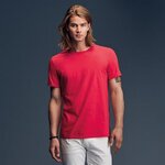 Short-sleeved T-shirt. Generous cut with tubular construction. Exact 2-ply crew neck, 1x1 ribbed collar with Elastane.