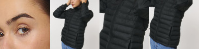 High collar with detachable hood including metal matte hidden snaps. Hood opening and bottom hem with adjustable plastic stopper and elastic cord. Zipped welt pockets with extra grosgrain pull. Fully quilted. 1x1 rib at sleeve hem.