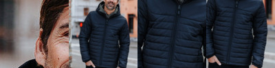 Men’s hooded softshell jacket, medium fit, with set-in sleeve and a high collar with panelled hood. Hood opening and bottom hem with adjustable plastic stopper and elastic cord. Reverse nylon zip at centre front. Zipped welt pockets with reflective elastic puller. Bonded three-layer fabric with internal membrane . Fully bonded fleece inside layer. Side panels and stretch for better shape. Adjustable hook and loop sleeve opening. Inside seams finished with recycled binding. Water-repellent up to 10,000mm, breathability up to 3000G/M2/24hrs allowing perspiration to escape. Windproof. Bionic ECO DWR (durable, water-repellent) finish.
