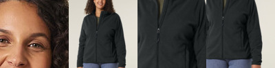 Set-in sleeves. Elastic recycled binding at cuffs and hem. Inside back neck recycled binding loop and back neck tape. Plastic Vislon zip with metal zip pull and cord ends. Fully bonded inside polar fleece layer and anti-pilling finish. Front side contrast softshell welt pockets with hidden zip closure. Contrast softshell fabric at pocket, back yoke and outer collar band. Inside invisible zip at the wearer’s left chest for easy decoration.
