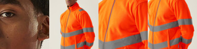 Warm-backed, woven, printable softshell fabric. Certified to EN ISO 20471:2013 A1:2016 Class 3. Orange colourway also conforms to RIS-3279-TOM. Two zipped lower pockets. Made with recycled content. Zip guard for comfort when worn. ID Reflection – angled chevrons inform whether you are facing forwards or away.