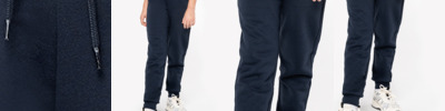 85% organic combed cotton/15% recycled polyester. Brushed back fleece.Enzyme washed.1x1 ribbed elasticated waistband with buttonhole eyelets and organic cotton drawcord.Two side pockets.Right rear pocket.1x1 ribbed cuffed leg ends.Tag free.Recycled polyester is made from post-consumer waste.