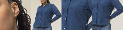 The Stella denim shirt for women. Medium fit. Point collar with single-needle topstitches. Collar stand with one contrast button. Front placket with single-needle topstitches on each side. Forwarded shoulder. Back yoke. Inside yoke in self-fabric. Set-in sleeves. Sleeve placket with one button. Cuff with two buttons. Straight cuff corners. Double pleats at cuff seam. Faded look on all seams due to garment washing – indigo yarn dyed product – so each garment may vary in appearance.