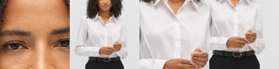Ladies fit.Stiffened collar.Self colour buttons.Back yoke and darts.Single button cuffs with bound slits.Straight hem.Tear out label.