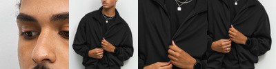 Relaxed fit.Dropped shoulders.2x2 ribbed high collar, cuffs and hem.Full length nylon zip.Two front welt pockets.Self colour stripe along the sleeves.Tear out label.