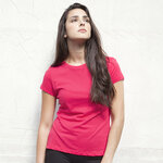 Feel good women's stretch t-shirt with enzyme wash for unique soft hand-feel. 96% cotton, 4% elastane for improved fit, comfort and shape retention. Modern long-line fit. Crew-neck with back neck binding and soft stretchy rib neckline. Features new tearab