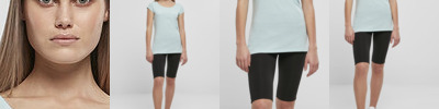 Modern fit women’s T. Longer length. Shaped side seams. Hemmed sleeved. Self fabric binding.