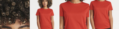 Performance T-shirt. Cationic dyed. Recycled polyester. Wicking fabric. Stretch. Crew Neck. Short Sleeve. Lightweight. Feminine fit. Twin-needle stitching on hem and arms. Textured fabric. Product contains no branded neck or waist label. Removable Kimble or looped garment tags. Inner seam label holds important product information on one label with a second label containing brand information which can be cut-away. UPF 40+.