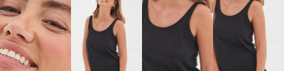 Tear-out label. Relaxed fit vest. Self-fabric binding around neck and armholes, with topstitching. Scoop neck and low scoop back. Curved hem, with gentle drop tail hem at back.