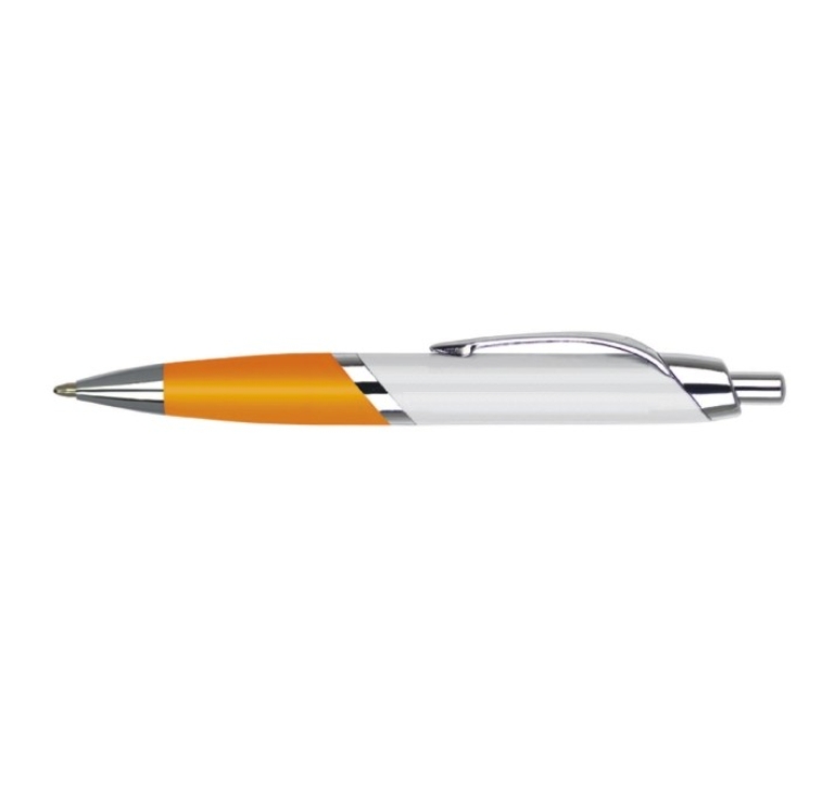 This range of popular push-button personalised pens is offered at a great price. The bright white barrels are an unusual oval shape and they are fitted with large rubber grips . They have chrome clips, nose-cones, push-buttons and an attractive diagonal band accent for a modern and stylish look. The coloured grips are available in black and orange so there is certain to be a colour to match any theme, occasion or corporate event. They come fitted with high quality black ink refills. Your personalisation is on the white barrels and your generous print area is 45mm x 10mm which will be printed in digital full colour for a striking and colourful look. These unusual pens are perfect for promotional events, shows, exhibitions, customer gifts as well as being perfect for smaller groups too. Our minimum order quantity is just 50.