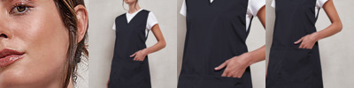 Waterproof and bleach resistant. Round neck. Double centre pocket. Flattering feminine fit measuring 86cm in length.