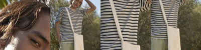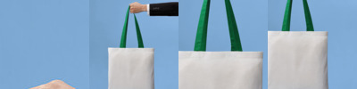 Two-tone cotton shopper. Long handles, 70 x 2.5cm. Inside hemmed sewing. Cross-stitches at handle. Perfect print surface.