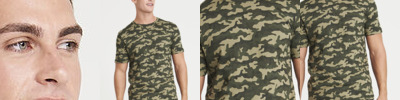Modern fit short sleeved T. Size tab label. All over camo print. Taped neck. Twin-needle stitching on sleeves and bottom hem. Ribbed crew neck style. Side seams. Set-in sleeves.