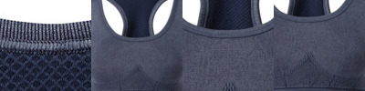 Seamless denim look sports bra. Grown-on waistband. Body sculpting design detailing. Medium impact. SEDEX certified. WRAP certified. We recommend using block out vinyl and inks.Product contains no branded neck or waist label.* Removable Kimble or looped garment tags. Inner seam label holds important product information on one label with a second label containing brand information which can be cut-away.