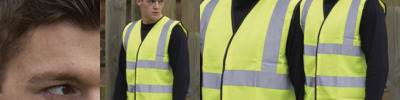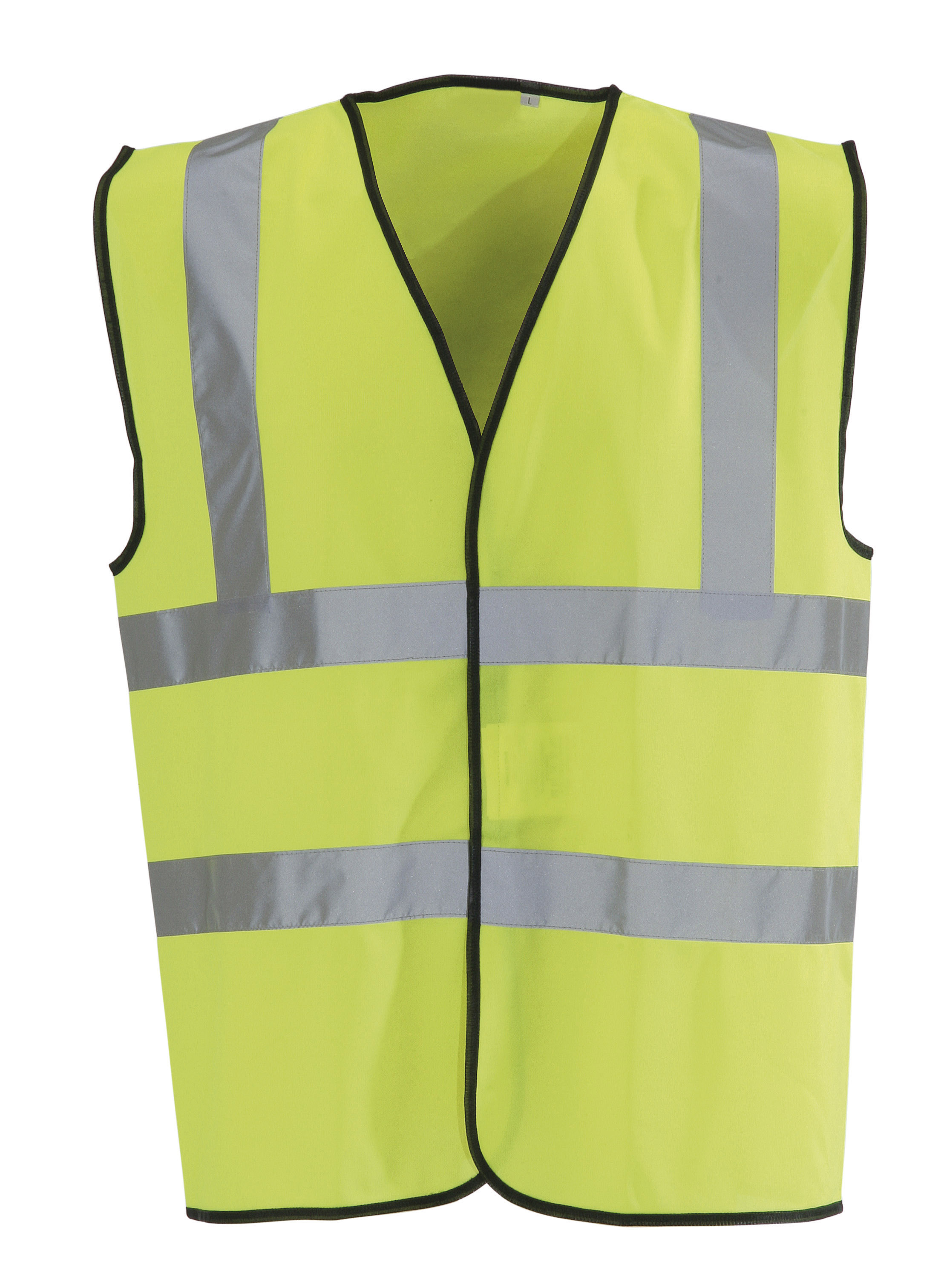 100% polyester. Conforms to EN ISO 20471: 2013 + A1: 2016 class 2. RIS-3279-TOM (orange only). Black polyester bound edges. Tear release front closure. Two reflective bands around the body and one over each shoulder.